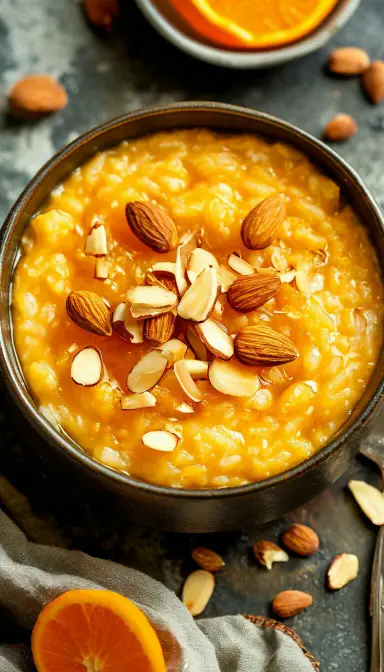 Смешать варенье или сироп с эфирным маслом апельсина, добавить в кашу при подаче. По желанию посыпать кашу миндальными лепестками.